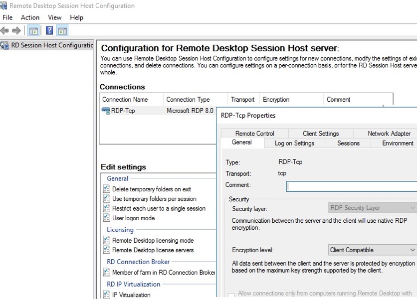 In addition, there is no Security tab in the tsconfig.msc console in the RDP-Tcp connection properties. This tab was handy for granting permissions to the tech support team (non-admin group) to connect and manage user sessions on RDS host. I use the following command to give a specific group full control over the RDP sessions on the server: