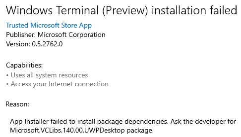 App Installer failed to install package dependencies. Ask the developer for XXXXX package.