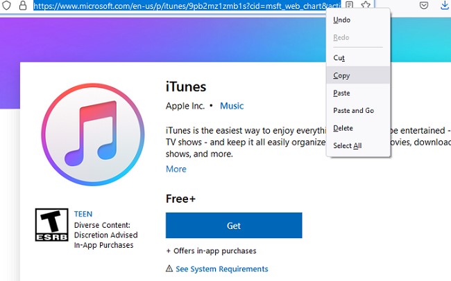- Open your browser, go to the Microsoft Store (https://www.microsoft.com/en-us/store/apps/windows?icid=CNavAppsWindowsApps), and open the page of the application you need. Copy the store app URL from the address bar. In our example, we will download the APPX installation files for the iTunes app (URL of this app https://www.microsoft.com/en-us/p/itunes/9pb2mz1zmb1s?cid=msft_web_chart );