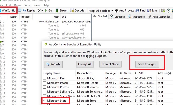 The AppContainer Exemption Loopback Utility window opens. In this list, you need to select the universal UWP apps whose traffic you want to redirect to Fiddler. To reduce the amount of traffic that Fiddler receives from other applications, select only the Microsoft Store application from the list and Save Changes.