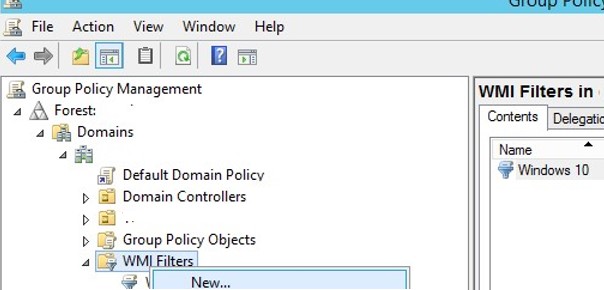 To create a new WMI filter, open the Group Policy Management console (gpmc.msc and go to Forest -> Domains -> woshub.com -> WMI Filters. This section contains all WMI filters in the AD domain. Create a new WMI filter (New).