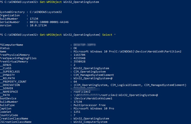 select Version from Win32_OperatingSystem WHERE Version like “10.0.17134” AND ProductType=”1″