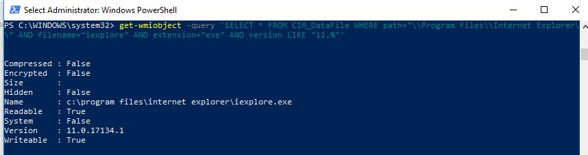 get-wmiobject -query 'SELECT * FROM CIM_DataFile WHERE path="\\Program Files\\Internet Explorer\\" AND filename="iexplore" AND extension="exe" AND version LIKE "11.%"'