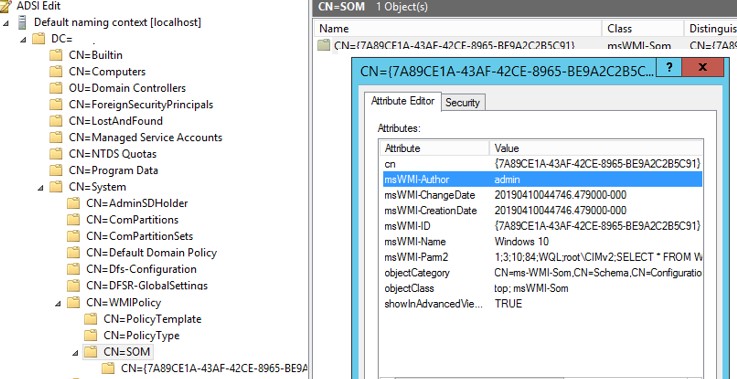 The created WMI filters are stored in the msWMI-Som class objects of the Active Directory domain in the section DC=…, CN=System, CN=WMIPolicy, CN=SOM, you can find and edit them using the adsiedit.msc.