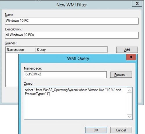 WMI filters in Group Policy (GPO) allow you to more flexibly apply policies to clients by using different rules. A WMI filter is a set of WMI queries (the WMI Query Language / WQL? is used) that you can use to target computers to which a specific group policy should be applied. For example, using the WMI GPO filter, you can apply a policy linked to an OU only to computers running Windows 10 (a policy with such a WMI filter won’t apply to computers with other Windows versions).