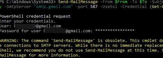 WARNING: The command 'Send-MailMessage' is obsolete. This cmdlet does not guarantee secure connections to SMTP servers. While there is no immediate replacement available in PowerShell, we recommend you do not use Send-MailMessage at this time. See https://aka.ms/SendMailMessage for more information.