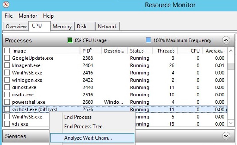 - Select the item Analyze Wait Chain from the context menu;