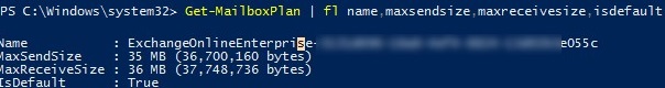Get-MailboxPlan | fl Name,MaxSendSize,MaxReceiveSize,isdefault