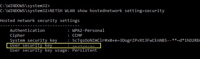 The following command displays the security settings of your Wi-Fi hotspot and saved connection password (User security key):