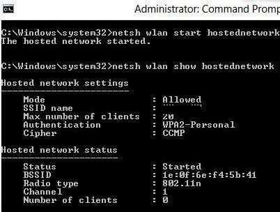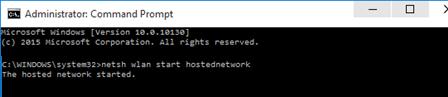 “The hosted network started” message indicates that a software Wi-Fi hotspot has been successfully started.