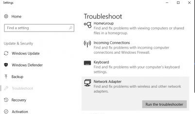 services.mscsnap-in or with the Get-Service PowerShell cmdlet:Get-Service SharedAccess; - Run the Network Adapter Troubleshooter tool (Network Adapter Troubleshooter: Troubleshoot -> Network Adapter -> Run Troubleshooter). The Network Troubleshooter tool will check the current network adapter settings and attempt to try to fix problems automatically;