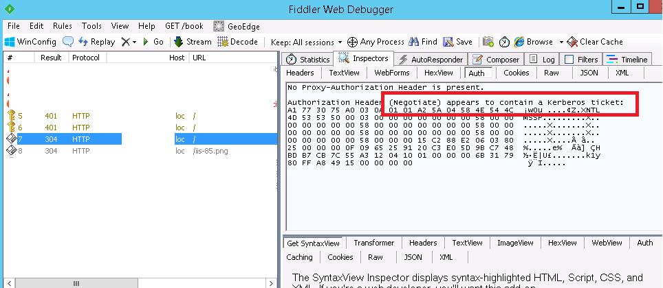 Start Fiddler and open the target website in the browser. In the left part of the window, find the line of website access. Go to the Inspectors tab in the right part of the window. The line “Authorization Header (Negotiate) appears to contain a Kerberos ticket” shows that Kerberos has been used to authenticate on the IIS website.