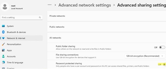 Also, make sure that network folder sharing is enabled under Settings -> Network & Internet -> Ethernet -> Change advanced sharing options. Check that Turn on file and printer sharing, Network Discovery (allows to show computers in the network environment) are enabled, and Turn off password protected sharing option is disabled in all network profile sections (Private, Public, All networks).