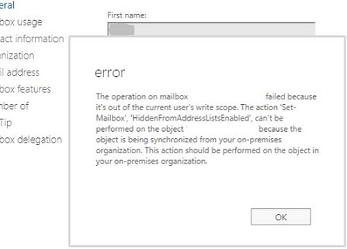 The operation on mailbox failed because it’s out of the current users’s write scope. The action ‘Set-Mailbox’, ‘HiddenFromAddressListsEnabled’, can’t be performed on the object because the object is being synchronized from your on-premises organization. This action should be performed on the object in your on-premises organization.