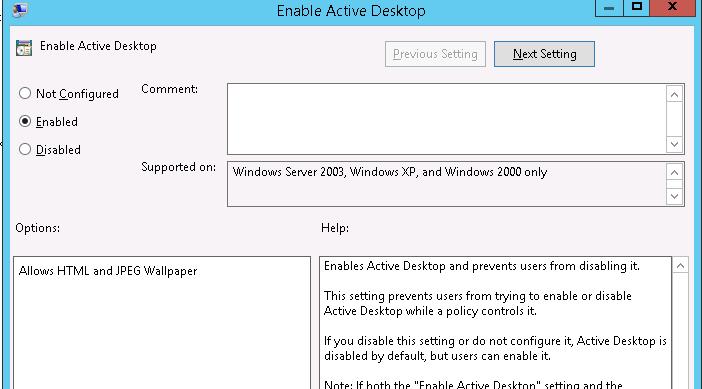 Then enable the Desktop Wallpaper policy. In the policy settings, specify the UNC path to the jpeg image file and select Fill as a wallpaper style.