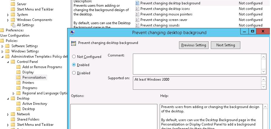 If you want to prevent users from changing the desktop background. Create the following registry key: [HKEY_CURRENT_USER\Software\Microsoft\Windows\CurrentVersion\Policies\ActiveDesktop]