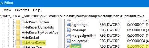 regedit.exe); - Go to HKEY_LOCAL_MACHINE\SOFTWARE\Microsoft\PolicyManager\default\Start\HideShutDown;