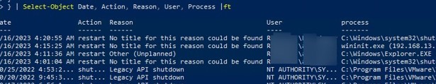 Use the following simple PowerShell script to list the last ten computer restart and shutdown events. This list contains the names of the users and processes from which the reboot was initiated.