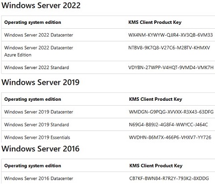 A complete list of the GVLK keys for all supported versions of Windows can be found on the Microsoft website at the following link https://learn.microsoft.com/en-us/windows-server/get-started/kms-client-activation-keys