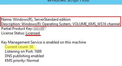 The command should return something like: Description =VOLUME_KMS_WS22 channel, License status =Licensed.