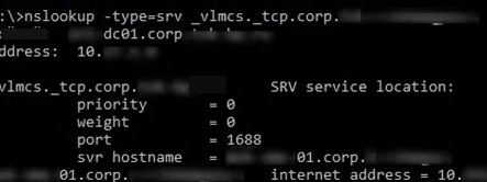 nslookup -type=srv _vlmcs._tcp.corp.woshub.com