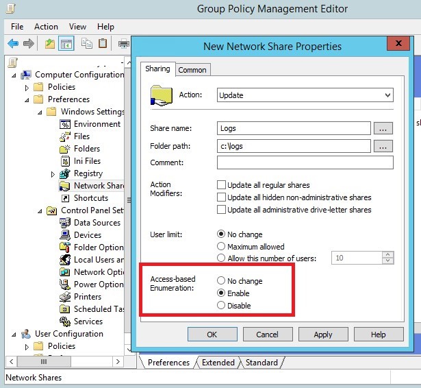 dfsutil property abde enable \\namespace_rootIn addition, you can enable ABE on computers in the AD domain using GPO. This can be done using GPP in the section: Computer Configuration -> Preferences -> Windows Settings -> Network Shares).