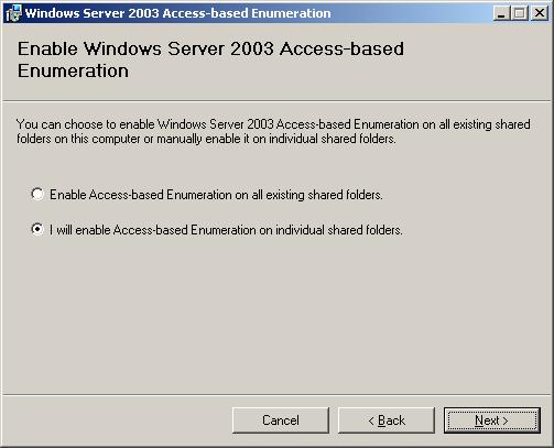 In Windows Server 2003 (not supported now), ABE became supported starting from Service Pack 1. To enable Access-based Enumeration in Windows Server 2003 SP1 (or later), you have to download and install a package following this link http://www.microsoft.com/en-us/download/details.aspx?id=17510. During installation you have to specify whether ABE will be enabled for all shared folders on your server or you’ll configure it manually. If you choose the second option, a new tab, Access-based Enumeration, will appear in the network share properties after the installation.