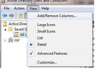 - In order to display the additional user attributes (e-mail address, department, etc.), open View menu in ADUC console and select Add/Remove Columns;