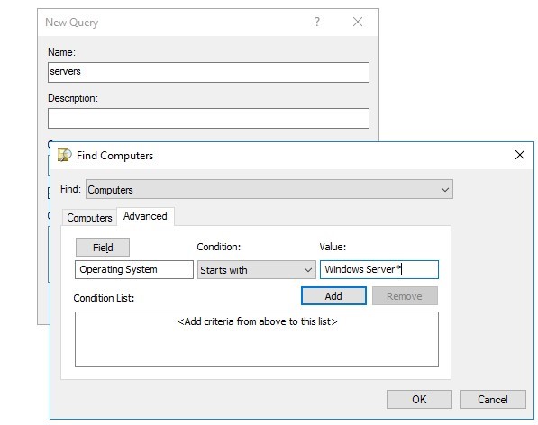 * (you can specify ‘*Server*‘). Multiple search criteria can be added to your saved query.Save the query and refresh the object list it in the ADUC console. The list will show all Windows Server objects in your domain.