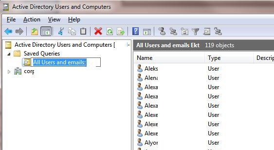 - Select the created query in ADUC console, press F5 to build the object list. As a result, a list of users will appear in the right window that matches your LDAP query;