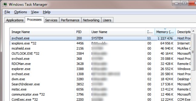 Problems have appeared on Windows 7 SP1 x86 and x64 clients when receiving updates from the local SCCM server (used to manage Microsoft updates on clients). Run Task Manager on a client and sort the running processes by the memory or CPU usage in the Processes tab. You can see that the current process svchost.exe is using 11% CPU and 1.2 GB of memory. In fact,?the svchost.exe is a container process, in which other programs and system service threads are running. Using Task Manager, you won’t be able to understand, which thread (service) causes high system load.