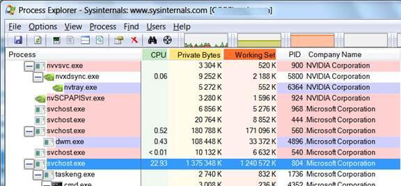 Run procexp.exe and find the problem process svchost.exe that uses too much memory and / or CPU.