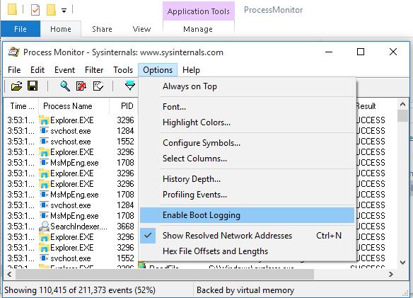 To diagnose the boot stage, Process Monitor creates a separate service in HKLM\SYSTEM\CurrentControlSet\Services section of the registry. This service loads the boot mode driver procmon23.sys that starts after Winload.exe is launched and logs the activity of all processes run during system boot and user logon.