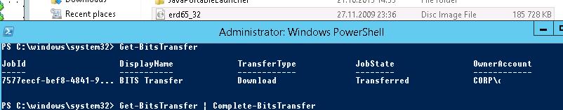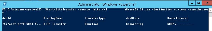 The asynchronous BITS task runs in the background, and the file download process is not displayed on the screen. The status of the BITS job can be obtained from the PowerShell console using the Get-BitsTransfer command: