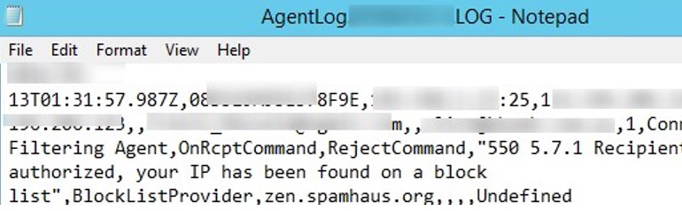 [email protected],,[email protected],1,Connection Filtering Agent,OnRcptCommand,RejectCommand,”550 5.7.1 Recipient not authorized, your IP has been found on a block list”,BlockLictProvider,zen.spamhaus.org,,,
