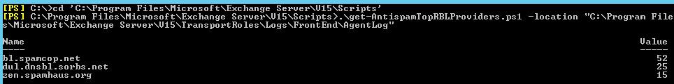 .\get-AntispamTopRBLProviders.ps1 -location "C:\Program Files\Microsoft\Exchange Server\V15\TransportRoles\Logs\FrontEnd\AgentLog"