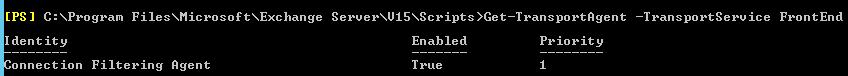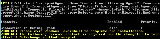 Install-TransportAgent -Name “Connection Filtering Agent” -TransportService FrontEnd -TransportAgentFactory “Microsoft.Exchange.Transport.Agent.ConnectionFiltering.ConnectionFilteringAgentFactory” -AssemblyPath “C:\Program Files\Microsoft\Exchange Server\V15\TransportRoles\agents\Hygiene\Microsoft.Exchange.Transport.Agent.Hygiene.dll”