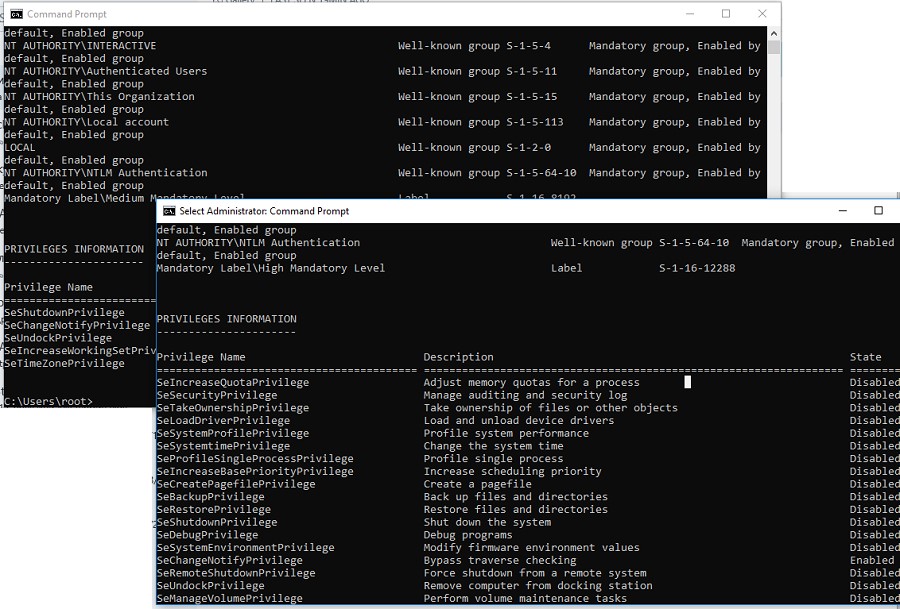You can use whoami /all command in two cmd.exe sessions (normal and elevated) of the same user and compare the current privileges, you can see that they are very different. The following table lists the differences in the security groups and current privileges in each session.