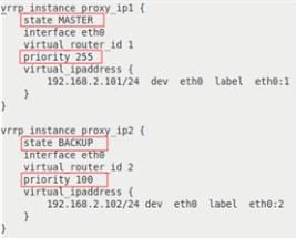 Keepalived_vrrp[xxxxx]: VRRP_Instance(proxy_ip1) forcing a new MASTER election Keepalived_vrrp[xxxxx]: VRRP_Instance(proxy_ip1) Transition to MASTER STATE Keepalived_vrrp[xxxxx]: VRRP_Instance(proxy_ip1) Entering MASTER STATE Keepalived_vrrp[xxxxx]: VRRP_Instance(proxy_ip1) setting protocol VIPs. Keepalived_vrrp[xxxxx]: Sending gratuitous ARP on eth0 for 192.168.2.101 | Keepalived_vrrp[xxxxx]: VRRP_Instance(proxy_ip1) Received advert with higher priority 255, ours 100 Keepalived_vrrp[xxxxx]: VRRP_Instance(proxy_ip1) Entering BACKUP STATE Keepalived_vrrp[xxxxx]: VRRP_Instance(proxy_ip1) removing protocol VIPs. |
