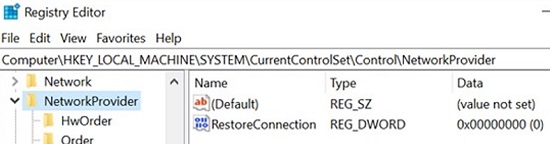 To do this, go to the registry key HKEY_LOCAL_MACHINE\SYSTEM\CurrentControlSet\Control\NetworkProvider, and create a new DWORD parameter with the name RestoreConnection and value 0.