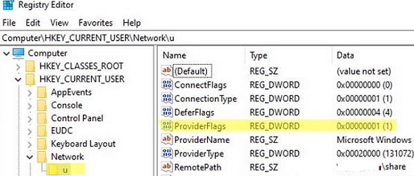 REG ADD "HKCU\Network\U" /v "ProviderFlags" /t REG_DWORD /d "1" /f