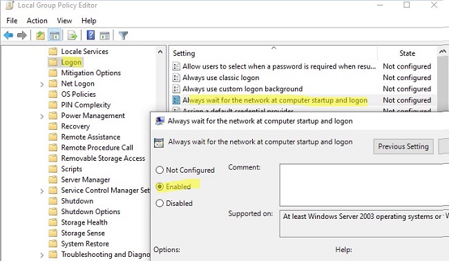 Windows may try to reconnect network drives at user logon before the network interface is fully initialized. To prevent mapped drives from connecting until the network is fully enabled, you can configure a specific Group Policy setting.
