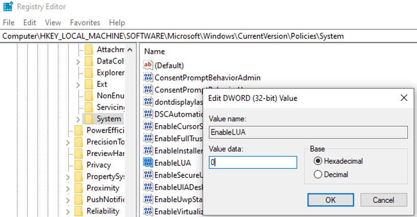 It is much more convenient and easier to turn off UAC through the registry. To do it, go to HKEY_LOCAL_MACHINE\Software\Microsoft\Windows\CurrentVersion\Policies\System in the Registry Editor (regedit.exe) and change EnableLUA value to 0.