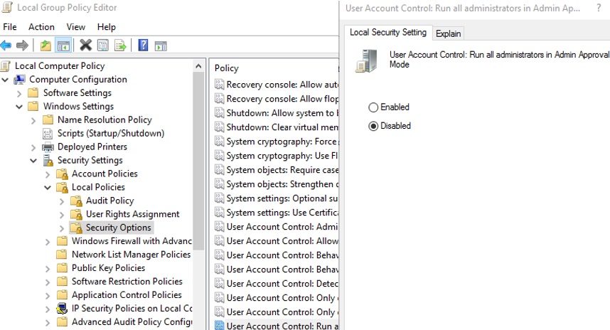 You can disable UAC through Group Policies. UAC GPO settings are located under Windows Settings -> Security Settings -> Security Options section. The names of the UAC policies start from User Account Control. Open the option “User Account Control: Run all administrators in Admin Approval Mode” and set it to Disable.?