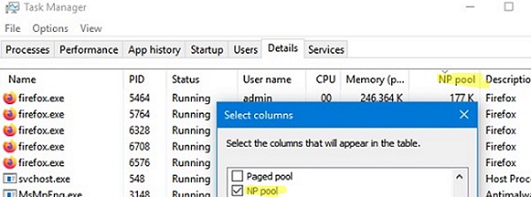 If your search does not return any results, check if the memory leak was caused by a user-mode process. Open the Task Manager, go to the Details tab, add the NP Pool column and look for processes with a large memory size in the non-paged pool.