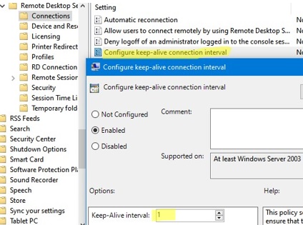 Also, if you are working on unreliable links, we recommend that you set the GPO option Configure keep-alive connection interval to 1 minute (Computer Configuration -> Administrative Templates -> Windows Components -> Remote Desktop Services -> Remote Desktop Session Host -> Connections).