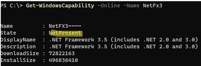 In our case, .NET 3.5 is not installed (State=NotPresent).