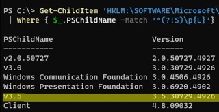 Get-ChildItem 'HKLM:\SOFTWARE\Microsoft\NET Framework Setup\NDP' -Recurse | Get-ItemProperty -Name version -EA 0 | Where { $_.PSChildName -Match ‘^(?!S)\p{L}’} | Select PSChildName, version