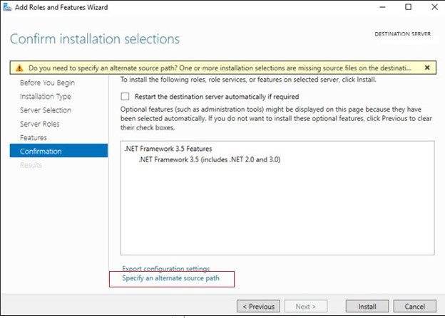 - Select the .Net Framework 3.5 feature as earlier, but prior to clicking Install, click a small link Specify an alternate source path at the bottom of the form;