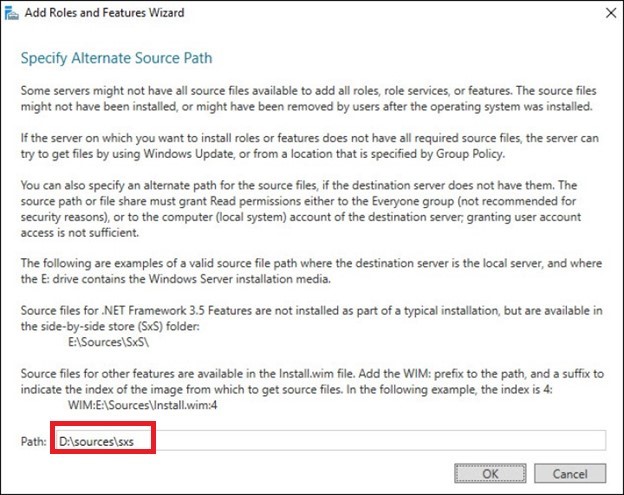 D:\sources\sxs. It can also be a network share, where you copied the distribution files (for example,\\fs1\iso\ws2016\sources\sxs). Then click OK.